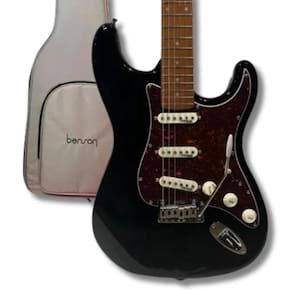 Guitarra benson Hardy 901 BK/TT, estilo Strato, captação SSS da Wilkinson, com corpo em Alder, braço e escala em Roasted Maple, Ponte Wilkinson, nut de Osso, ferragens cromadas e com bag. Na cor Preta com escudo Tortoise. Apresentando o modelo 901 BK/TT da série Hardy, esta guitarra é uma obra-prima de engenharia e design, destinada a elevar sua experiência musical a um novo patamar. Com um corpo de Alder que oferece ressonância profunda e um braço de Roasted Maple em formato C para conforto e jogabilidade excepcionais, a Benson 901 garante uma experiência de toque suave e responsiva. Os captadores Wilkinson Single Coil Alnico 5 proporcionam uma variedade de tons ricos e expressivos, enquanto a ponte Wilkinson Tremolo WOV6 oferece estabilidade de afinação e ação suave. Além de sua excepcional qualidade sonora, a Benson 901 apresenta um design elegante e durável.