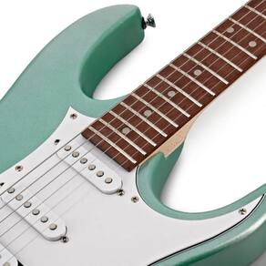 Modelo: GRX40 Construção: Braço parafusado bolt-on Material do Braço: Maple Corpo: Poplar Braço: GRX Escala: Jatobá Tamanho da escala: 25,5 Trastes: 22 Espaçamento das cordas: 10.5mm Ponte: T106 Tremolo Trastes: Médio Ferragens: Cromadas Escudo: Branco Marcação: Dot tipo Ponto Branco Captação: Infinity RS S Braço Passivo/Cerâmico Infinity RS S Meio Passivo/Cerâmico Infinity R H Ponte Passivo/Cerâmico Afinações de fábrica: 1E,2B,3G,4D,5A,6E Cordas: .009/.011/.016/.024/.032/.042 Controles: 1 Volume + 1 Tone e chave de 3 posições Cor: Metallic Light Green MGN Ean: 4515276836551