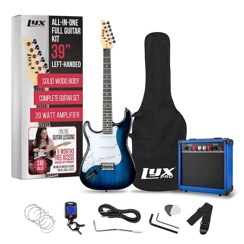 LyxPro Guitarra elétrica canhota de 99 cm e kit de iniciante para canhoto de tamanho completo para guitarra iniciante, amplificador, seis cordas, duas palhetas, alça de ombro, sintonizador de clipe