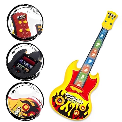 Som e luzes: ao pressionar os botões, o brinquedo emite sons e luzes, tornando a brincadeira ainda mais emocionante. Estímulo à criatividade e coordenação: a guitarra ajuda a desenvolver a criatividade, a coordenação motora, a noção de ritmo e a percepção musical. Design estiloso: semelhante às guitarras de verdade, com um visual rock and roll que as crianças vão adorar. Cor vibrante: amarelo vibrante que chama a atenção e alegra a brincadeira. Diversão em grupo: ideal para formar uma bandinha infantil com os amigos e soltar a imaginação. Presente perfeito: uma ótima opção para aniversários, natal e outras ocasiões especiais. Guitarra infantil premium led e som instrumento criança
