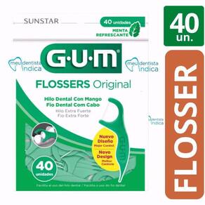 Flosser com fita dental sabor menta que limpa profundamente entre os dentes, removendo a placa e restos de comida.O Fio Dental Gum Flossers é uma haste com fio dental em sabor de menta refrescante, ideal para uso rápido e conveniente para o dia a dia, possibilitando o cuidado em qualquer momento desejado. O que éO Fio Dental Gum Flossers auxilia a limpeza interdental para cuidar dos espaços que as escovas comuns não conseguem alcançar, garantindo a eliminação da placa bacteriana e detritos de alimentos entre os seus dentes. Eficaz na limpeza interdental, prático e descartável.Para que servePermite alcançar lugares de difícil acesso, sendo mais fácil e prático de usar que o fio dental, além de prevenir cáries e evitar inflamação das gengivas. Sabor de menta refrescante.Modo de usarUtilize sempre após a escovação.