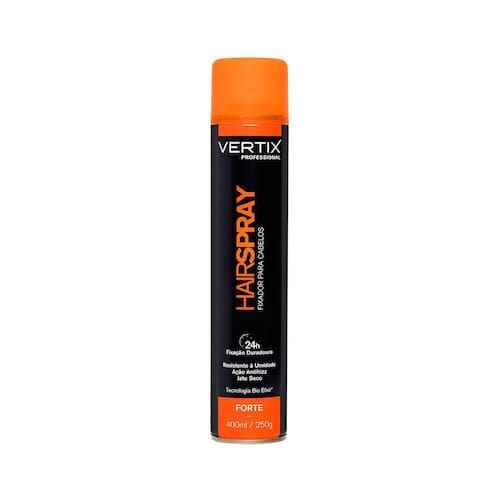 Hair Spray Forte 400ml Vertix Prolonga o efeito modelar franjas e mechas. Características • Tecnologia Bio Elixir: uma combinação de óleos nutritivos, vitaminas e sais minerais, que não ressecam os fios. • Tecnologia Flexível: permite que o produto seja retirado com água ou penteando os cabelos com uma escova, sem agredi-los. • Fixação flexível e duração de 24h. • Resistente à Umidade • Ação Antifrizz • Jato Seco • Perfeito para modelar qualquer tipo de penteado