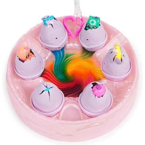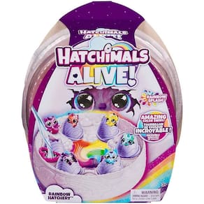 Experimente a incrível revelação do Viveiro Arco-Íris! Remova as asas de cada ovo e encha lentamente o coração com água ? observe a água mudar de cor, girando em um efeito de arco-íris conforme cada personagem começa a chocar! Com seu amor e cuidado, magicamente dê vida a 6 personagens Hatchimals Rainbow Splash. Os ovos surpresa eclodem na água, revelando 1 de 6 tons de arco-íris para combinar com cada personagem.