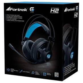 Headset gamer pro h2 preto fortrek Descrição Marca: fortrek Modelo: h2 Produto com 2 entradas p2 + 1 usb apenas para alimentação dos leds. O headset gamer h2 da linha fortrek pro é recomendado para gamers que buscam o profissionalismo, com alças flexíveis e fones acolchoados é ideal para quem vira noites em jogos prolongados. Acabamento moderno com iluminação lateral em leds azuis, o seu microfone possui cancelamento de ruídos, bloqueando sons externos mantendo a qualidade do seu áudio. Acompanha um controlador de volume embutido atrás do fone esquerdo, facilitando a vida do jogador. O headset h2 da fortrek é muito leve, pesando apenas 318 gramas, a sensação de usá-lo é bem agradável. O seu cabo trançado proporciona uma durabilidade maior e medindo 2 metros de comprimento, a distância não será mais problema. Características Conector: 2x p2 + 1x usb Cor: preto com leds azuis Impedância: 32ohms +-15% Sensibilidade: 112db+-3db Peso: 318g Resposta frequência: 20hz20khz Detalhes Comprimento: 2.0m Outros Informação adicional: - falantes: 40mm Microfone: - sensibilidade mic: 38db+-3db - dimensão do mic: 6.05mm - polaridade: omni-direcional - microfone com cancelamento de ruído