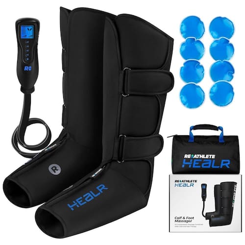CUIDADO E APROVEITE Seu massageador de pernas REATHLETE é o seu caminho para desfrutar de conforto e relaxamento e contribuir para a saúde do seu corpo. Os massageadores elétricos exigem um esforço mínimo de você, ajudando o a se aquecer antes do treino, a se recuperar após um, a melhorar o fluxo sanguíneo e a aliviar vários tipos de dor. Massagem e compressão de ar são complementos importantes para qualquer programa de condicionamento físico que você esteja construindo e para qualquer que seja o seu padrão de atividade física.