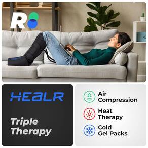 DESCUBRA OS BENEFÍCIOS DE SAÚDE DA TERAPIA TRIPLA No HEALR, combinamos três tecnologias terapêuticas é um massageador de compressão das pernas com airbags aplicando força forte em suas panturrilhas e pés é um massageador de pés com calor para tratar dores musculares e fadiga e tem a função de terapia a frio almofadas de gel especiais estão incluídas no conjunto para lidar com dores agudas.