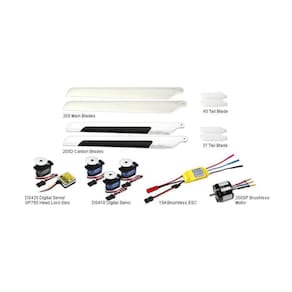 Características do T-Rex 250SE Super Combo: * O conjunto de cabeça do rotor principal recém-projetado aumentou a resistência da parte metálica. A utilização de rolamentos de alta precisão resultou em características de voo de estabilidade e agilidade aprimoradas. A alavanca de controle de metal recém-projetada e a placa oscilante de metal CCPM melhoraram o desempenho 3D.* O novo guia antirrotação, com a base do quadro reforçado, aumentou a resistência da estrutura para o quadro principal.* Os retentores de parafuso servo recém-projetados para simplificar a instalação e a manutenção.* Os patins de pouso reforçados aumentaram sua durabilidade. Os furos de parafuso antiderrapantes adicionados facilitam a montagem.* A unidade de correia de cauda de unidade única com as novas alças de lâmina de cauda contrapesadas facilitam a montagem e melhoram a eficiência do leme.* Canopy de design aerodinâmico, com pintura colorida para fazer contraste eficaz no ar. Especificações: * Comprimento: 430 mm* Altura: 163 mm* Comprimento da lâmina principal: 205 mm* Diâmetro do rotor principal: 460 mm* Diâmetro do rotor de cauda: 108 mm* Engrenagem do motor Ponion: 15T* Engrenagem de transmissão principal: 120T * Engrenagem de transmissão da cauda: 28T* Relação da engrenagem de transmissão: 1:8:4,28* Peso (sem sistema de energia): 148 g* Peso de voo: aproximadamente 340 g