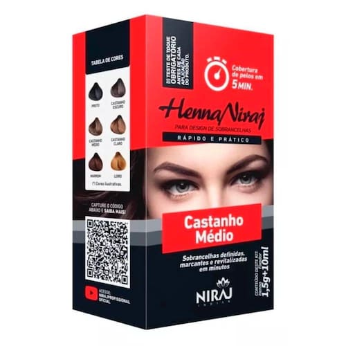 A Henna Para Sobrancelha Niraj 5 Minutos foi desenvolvida especialmente para pessoas que desejam corrigir o formato de suas sobrancelhas (seja por serem ralas, finas, curtas, com falhas ou diferente um da outra). Com ótima fixação e durabilidade, a Henna Niraj Para Sobrancelha 5 Minutos Preta proporciona um design definido e marcante para iluminar e rejuvenescer o olhar.
