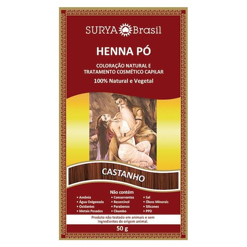 HENNA PÓ SURYA BRASIL CASTANHO Coloração e tratamento capilar com extratos orgânicos. Não contém água oxigenada, amônia, metais pesados, resorcinol ou parabenos. Não é uma coloração permanente, sai gr