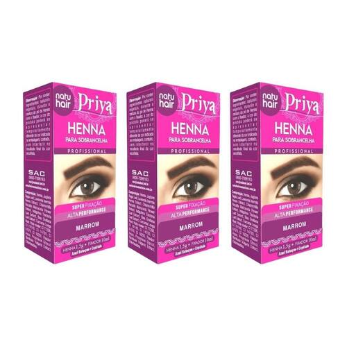 Henna para sobrancelhas priya natuhair 1,5g marrom - kit com 3un Descrição A henna para sobrancelhas priya natuhair 1,5g na cor marrom é ideal para quem busca definição e preenchimento das sobrancelhas de forma natural e duradoura. Com uma fórmula suave e de fácil aplicação, esta henna oferece cobertura uniforme e cor intensa, valorizando o formato das sobrancelhas e proporcionando um olhar mais expressivo. Perfeita para todos os tipos de pele, a henna priya natuhair garante um resultado , durando por dias sem desbotar. Modo de uso Misture a henna para sobrancelhas priya natuhair com algumas gotas de água até formar uma pasta homogênea. Aplique nas sobrancelhas limpas e secas, utilizando um pincel ou cotonete para contornar e preencher a área desejada. Deixe agir por 15 a 20 minutos, dependendo da intensidade de cor desejada. Após o tempo de pausa, remova o excesso com um algodão umedecido. Evite o contato com a água nas primeiras 24 horas para prolongar a durabilidade da cor. Marca: Não Informado