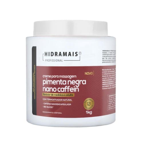Hidramais Creme Pimenta Negra Nano Caffein 1 KG - Hidramais Creme Pimenta Negra Nano Caffein Hidramais Creme Pimenta Negra Nano CaffeinO que é O Creme para Massagem Pimenta Negra Nano Caffein Hidramais é um produto com nanotecnologia de uso corporal indicado para quem busca redução de medidas de forma eficaz. Não testado em animais.O que ele fazEsse produto promove a melhora da oxigenação e do fluxo sanguíneo, potencializando o efeito da massagem modeladora, com ação e eficácia comprovada na redução de medidas. Sua fórmula promove intenso aquecimento, amenizando a celulite e ativando a microcirculação periférica, que melhora a oxigenação e o fluxo sanguíneo.O que ele temO Creme para Massagem Pimenta Negra Nano Caffein Hidramais tem em sua fórmula a combinação entre o silício orgânico, nanotecnologia e um blend de termoativadores naturais ricos em capsaicina, piperina e ácido fólico, que possuem propriedades vasodilatadoras e ativadoras da microcirculação dos tecidos. O produto contém Pimenta Negra, ativo natural de aquecimento e cafeína nanoencapsulada. Produto sem testes em animais.Como usarAplique sobre a pele com manobras de massagem redutora. Use sempre uma espátula para retirar o produto da embalagem, reduzindo o risco de contaminação.Características Gerais do Produto: Produto: Creme de Massagem Gênero: Feminino Marca: HidramaisAcompanha o produto: 1 Creme Pimenta Negra Nano CaffeinGarantia: Sem Garantia