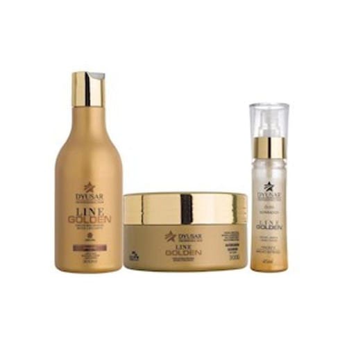 O kit contém: 01 Shampoo Ouro Dyusar Line Golden 300ml 01 Máscara Banho de Ouro Dyusar Line Golden 300g 01 Óleo Reparador Dyusar Line Golden 45ml