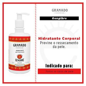 O Hidratante Corporal Gengibre de Granado previne o ressecamento da pele. Formulado com glicerina vegetal e óleos naturais de amêndoa doce, semente de uva e castanha do Brasil. Enriquecido com extrato natural de gengibre, que tem ação energizante. Perfumação prolongada.