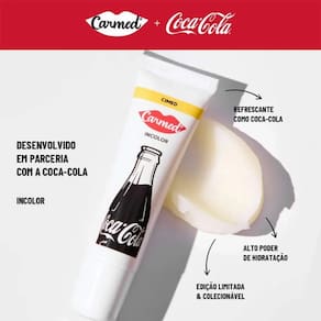 Hidratante Labial Carmed Coca-Cola Incolor 10gCarmed + Coca-Cola Incolor 10g a parceria icônica entre Carmed e Coca-Cola em um hidratante labial único, que é refrescante, colecionável e cheio de estilo. Carmed Coca-Cola Incolor hidrata intensamente, tem textura irresistível e a refrescância que só Coca-Cola inspira. Um cuidado prático para qualquer momento.· Fórmula hidratante Carmed· Efeito refrescante como Coca-Cola· Incolor