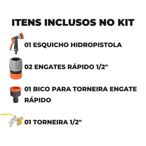 ITENS INCLUSOS 01 Torneira de Metal 1/2 e 3/4 01 Esguicho Hidropistola 6 Jatos Mangueira Jardim Para Engate Rápido 02 Engates Rápido 01 Bico Com Engate Rápido Para Torneiras de 3/4 + Adaptador para Torneiras de 1/2 Marca: Não Informado Ean: 7894141423773