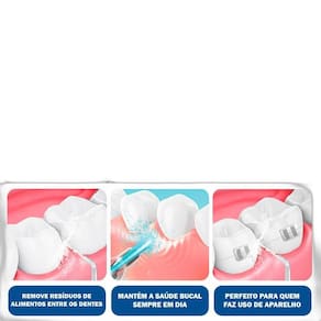 Realiza limpeza profunda Limpeza profunda e sem dor entre os dentes e abaixo da linha da gengiva por meio de jatos contínuos ou pulsativos de água, removendo resíduos de alimentos e bactérias de áreas em que a escovação e o fio dental tradicional não alcançam.