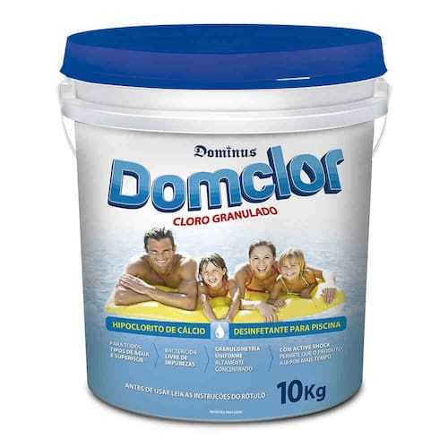Com o sistema de filtração em funcionamento na posição filtrar, aplique 4 gramas de Cloro Granulado Domclor para cada m³ (1000 L) de água, dissolvendo o produto com água da própria piscina em um balde plástico previamente limpo e aplicando ao longo das laterais conforme necessidade, de preferência no final da tarde para noite.