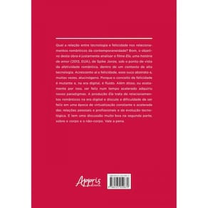 Qual a relação entre tecnologia e felicidade nos relacionamentos românticos da contemporaneidade? Bom, o objetivo desta obra é justamente analisar o filme Ela, uma história de amor (2013, EUA), de Spike Jonze, sob o ponto de vista da afetividade romântica, dentro de um contexto de alta tecnologia. Acrescento aí a felicidade, esse suco abstrato e, muitas vezes, alucinógeno. Porque o conceito de felicidade é mutante e, na era digital, é fluido. Além disso, ou exatamente por isso, ser feliz num tempo acelerado adquiriu novos paradigmas. A produção Ela trata de relacionamentos românticos na era digital e discute a dificuldade de ser feliz em uma época de virtualização constante e acelerada das relações pessoais e profissionais e da evolução tecnológica. E tem uma discussão muito boa na segunda parte, sobre o corpo e o não-corpo. Vale a pena.