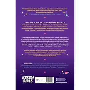 CELEBRE A MAGIA DAS GAROTAS NEGRAS Neste quarto volume da coleção Histórias de ninar para garotas rebeldes você encontrará vivências de garotas pretas que venceram desafios e chegaram ao topo. Foram selecionadas 100 mulheres negras que ousaram mudar o mundo e deixaram um grande legado para todas nós. Como a diversidade sempre foi algo presente nesta coleção, não poderia ser diferente neste volume: aqui, você encontrará as mais variadas histórias, seja de mulheres contemporâneas como a jogadora de tênis Naomi Osaka, ou de figuras históricas como a aviadora Bessie Coleman, chegando até a cineasta Ava DuVernay, a musa do soul Aretha Franklin, a ativista Angela Davis, a política e ativista Erika Hilton e muito mais! Você irá descobrir fatos e curiosidades, além de conhecer os ideais e objetivos que contribuíram para a formação dessas mulheres extraordinárias e para a construção de seus legados nas mais distintas áreas de atuação! “Uma celebração visual das mulheres negras ao redor do mundo; estas páginas irão mostrar de forma vívida uma vasta gama de contribuição e culturas.” - Tarana Burke, fundadora do movimento #MeToo.