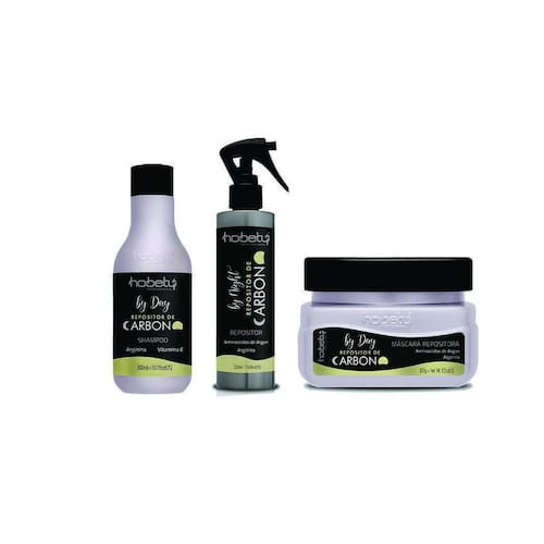 Hobety Kit Repositor De Carbono com FinalizadorEsse kit contem:01 Shampoo Repositor de Carbono de 300 ml01 Mascara Repositora de Carbono de 300 grs01 Finalizador Repositor de Carbono de 220 grsElaborado para os cabelos que tiveram desgaste natural ou pelo uso inadequado de tratamentos químicos, danos térmicos, ou ainda pela ação do sol, calor e cloro.Auxiliando a fibra capilar no combate da sua porosidade, potencializando a hidratação , mantendo - os saudáveis, brilhantes e macios por mais tempo.Seus ativos promovem uma ação suave da retirada dos radicais livres, auxiliando a reposição de carbono na fibra.Ativos e vitaminas:Aminoácidos de ArganArgininaVitamina EModo de Usar:Após lavar os cabelos com o Shampoo Repositor de Carbono, deixe agir por alguns minutos, enxágue e repita a lavagem se necessário.Com os cabelos úmidos aplique a Máscara Reposição de Carbono deixando agir por alguns minutos e enxague. Finalize como desejarFinalizador Repositor Carbono Modo de usar :Agite antes de usar , antes de dormir borrife no comprimento dos fios e aguarde 10 minutos . Não enxaguar . No dia seguinte com os cabelos molhados utilize o shampoo repositor de carbono , se necessário repita a operação, enxaguar e aplicar a máscara repositora de carbono deixar po alguns minutos e enxaguar . Finalize como desejar. Finalizador Repositor de Carbono contém Aminoácidos de Argan e Arginina.