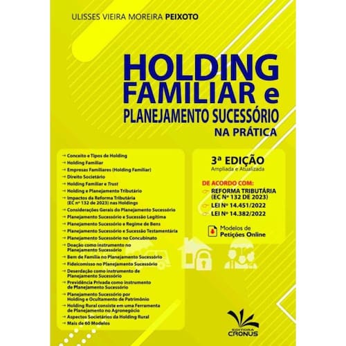 O livro em análise conta com a reunião de dois temas de extrema relevância, a Holding e o Planejamento Sucessório. A primeira parte consiste na Holding, que foi desenvolvida com os seguintes capítulos: Conceito e Tipos de Holding; Holding Familiar; Empresas Familiares (Holding Familiar); Direito Societário; Holding Familiar e Trust e Holding e Planejamento Tributário; Impactos da Reforma Tributária (EC n 132 de 2023) nas Holdings. A segunda parte trata do Planejamento Sucessório, que foi dividida nos seguintes capítulos: Considerações Gerais do Planejamento Sucessório; Planejamento Sucessório e Sucessão Legítima; Planejamento Sucessório e Regime de Bens; Planejamento Sucessório e Sucessão Testamentária; Planejamento Sucessório no Concubinato; Doação como Instrumento no Planejamento Sucessório; Bem de Família no Planejamento Sucessório; Fideicomisso no Planejamento Sucessório; Deserdação como instrumento de Planejamento Sucessório; Previdência Privada como instrumento de Planejamento Sucessório; Planejamento Sucessório por Holding e Ocultamento de Patrimônio; Holding Rural consiste em uma Ferramenta de Planejamento no Agronegócio e Aspectos Societários da Holding Rural. O livro em tela conta com mais de 60 modelos práticos, tais como: Procuração; Contrato de Holding; Contrato de Constituição de Sociedade Limitada; Declaração de Concubinato; Escrituras; Extinção de Fideicomisso; Ação Ordinária de Deserdação; Testamentos; Mandado de Segurança; Recursos; Contrarrazões etc. Diante disso, o Jurista Ulisses Vieira Moreira Peixoto apresenta ao público em geral e a comunidade jurídica, a presente obra que possui um conteúdo objetivo e prático, com a finalidade de auxiliar os estudiosos no assunto.