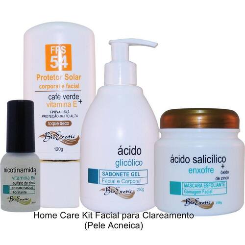 A. Lavar o rosto com o Sabonete Neutro de Clorexidine. Retirar com bastante com água ou gaze umedecida em água. B. Em dias alternados aplicar uma fina camada da Gomagem Facial máscara esfoliante deixar agir alguns minutos deixar secar . Friccionar com a ponta dos dedos, esfregando aos poucos todas as regiões do rosto. Retirar o restante com água ou gaze umedecida em água . C. Aplicar o Sérum Facial de Nicotinamida, Zinco e Vit. B6 em toda face até a absorção total do produto. D. Aplicar o Protetor Solar FPS 54 em toda face para finalizar o tratamento. Ean: 7898561570376