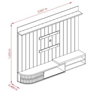 A bancada possui detalhes curvos no tampo e na base, painel com detalhes em paineis sobrepostos, alem do puxador em bronze que combina perfeitamente com seu design moderno. Otimiza o espaco da sala de estar e suporta TVs de ate 75, ele e uma solucao versatil que proporciona uma experiencia visual impactante e redefine os padroes de design de interior.