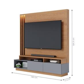 Possui um painel para TVs de até 75 polegadas, com detalhes em ripado na lateral, três nichos internos e duas portas basculantes com pistão a gás, tornando ele perfeito para organização de aparelhos eletrônicos e objetos decorativos