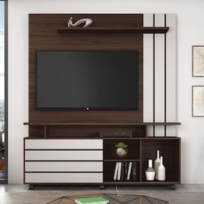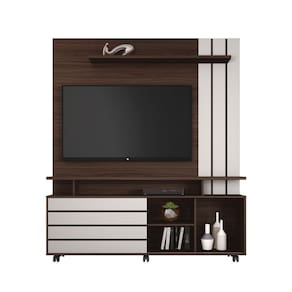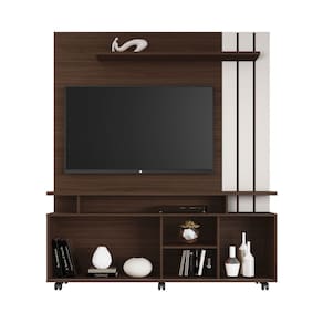 Seu painel comporta TVs de até 65 polegadas garantindo centralização e destaque para o entretenimento, enquanto os nichos e prateleiras permitem organizar eletrônicos, livros e objetos decorativos de forma prática e harmoniosa.