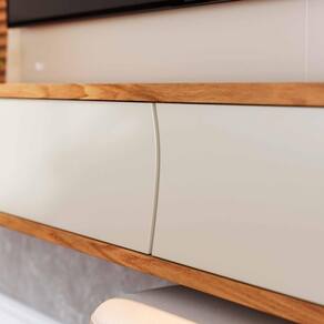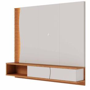 Cor: Off White/Freijo Para de Até: 65 Polegadas Possui Iluminação: Sim,1 Spot de LED Possui Nicho: Sim, 1 Possui portas: Sim, 2 portas basculante com detalhes curvados e com dobradiças metálicas Possui Decoração: Sim, Ripados Decorativos Possui prateleiras: Não Peso máximo suportado pelo painel: 35 Kg Acabamento em Pintura UV - Fosco Material: MDF 15mm, MDP 12mm, MDP 15mm, MDP 25mm