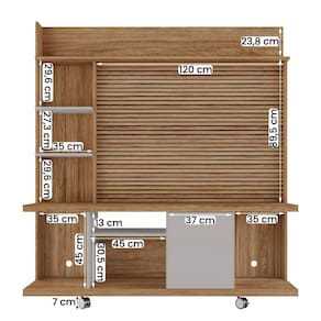Possui 4 prateleiras para decoração, 1 porta com dobradiças metálicas e rodízios que facilitam a movimentação.