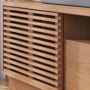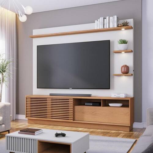 Uma ótima opção para clientes que buscam por um móvel espaçoso e cheio de personalidade, o Home Theater Campeche possui um design clean e moderno. Com um painel para TVs de até 70, possui prateleiras superiores iluminadas por spots de LED, que trazem a sensação de tranquilidade e aconchego ao ambiente. Além disso, possui nichos internos e uma gaveta com corrediças telescópicas que são ideais para organização de aparelhos eletrônicos e demais objetos decorativos. Seu destaque fica por conta de sua porta deslizante ripada com brises que dão um toque especial do estilo contemporâneo ao móvel.