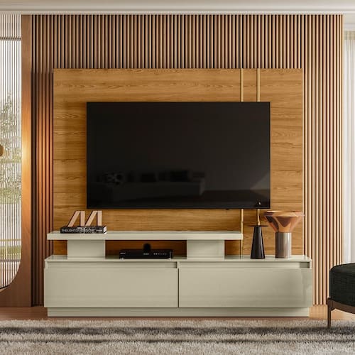 Características: Estrutura em MDP Pintura semi brilho Gavetas com corrediças Telescópicas Espaço para TV até 75 Polegadas.