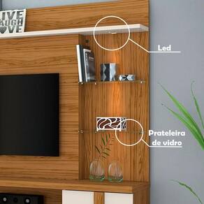 Característica do Estante Home Theater para de até 55 Polegadas: - Estrutura em MDP de 15, 25 e 40mm de espessura; - Acabamento de pintura em UV; - Para de até 55 polegadas fixada no home; - Espaço para (AxLxP) 99x136x26 cm; - Acompanha luminárias de led; - 1 porta com dobradiças metálicas; - Prateleiras de vidro com 5mm de espessura; - Não acompanha objetos de decoração e aparelhos eletrônicos;