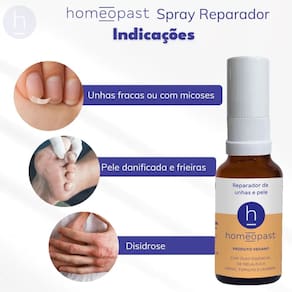 Homeopast Spray Reparador é Indicado para tratar e manter as unhas e pele sempre saudáveis. Sua ação regeneradora repara os tecidos danificados, promove hidratação profunda e fortalece as unhas que estejam fracas ou quebradiças.