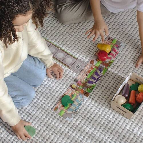“Hoje é dia de feira! Os feirantes acordaram cedo e trouxeram frutas, legumes e verduras fresquinhos, e os clientes estão chegando para comprar. Vamos ajudá-los a preparar as barracas para a chegada dos clientes?”Um jogo colaborativo, que desenvolve habilidades como: entendimento de regras, linguagem e comunicação, criatividade e familiarização com os alimentos. Como jogar? Lance o dado para sortear qual categoria de alimento será organizada na sua respectiva barraca (Legumes, Frutas ou Verduras). Caso a face sorteada do dado seja a figura do peão (cliente), ele anda uma casa do caminho em direção à feira. O objetivo é organizar todas as barracas antes que os clientes cheguem para fazer suas compras! Além do jogo, há outras formas de brincar. Aqui vão algumas ideias. Invente a sua também! • Vamos nos familiarizar com os alimentos: as peças de madeira representam os alimentos e, ao manipulá-las, a criança aprende sobre eles. • Faz de conta: monte uma quitanda ou seja o entregador do bairro. Não há limites para a imaginação! Marca: LUME