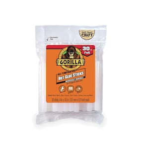 Bastões Gorilla Hot Glue, tamanho real, 4 polegadas de comprimento x 0,43 polegadas de diâmetro, 30 unidades, transparentes, adere: madeira, metal, vidro, plástico, floral, tecido, couro, espuma e muito mais (pacote com 1 com 30 bastões de cola)