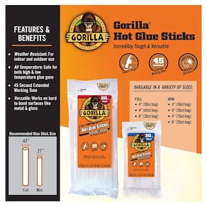 - VERSÁTIL: os bastões de cola quente Gorilla Glue unem uma variedade de materiais, como madeira, plástico, flores, tecidos, couro, formas e muito mais. Funciona até mesmo em superfícies difíceis de colar, como metal e vidro.