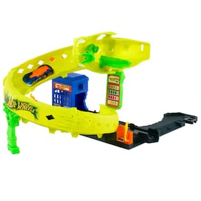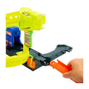 Você pode correr e fazer acrobacias no conjunto Hot Wheels Ataque de cobra, que apresenta uma enorme cobra nêmesis e duas maneiras de brincar! Você pode dirigir até o conjunto e abastecer nas bombas de gasolina que têm mangueiras ajustáveis, depois pode ir até o minimercado que também é um lançador secreto. Bater no lançador com força suficiente envia carros em alta velocidade pela boca da cobra e evita que fiquem presos e sejam comidos.