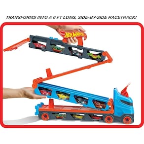 "Acelere para uma experiência completa com o Hot Wheels® City Reboque de Pista de Corridas™, um super caminhão 3 em 1 que combina transporte, armazenamento e competição em um único brinquedo! Este reboque versátil transporta até 22 veículos Hot Wheels® em escala 1:64 (3 incluídos), visíveis através de janelas laterais transparentes. Mas a verdadeira ação começa quando as crianças puxam a trava traseira: o caminhão se transforma em uma pista de corrida com 2,5 metros de extensão, pronta para duelos radicais. Na parte frontal, a cabine se converte em um lançador duplo, que envia dois carros ao mesmo tempo para uma corrida justa. O primeiro a cruzar o fim da pista ativa o mecanismo de vitória, enquanto o outro fica retido – ideal para estimular o espírito competitivo com emoção. A diversão não para por aí: conecte a pista a outros conjuntos Hot Wheels™ City (vendidos separadamente) e amplie as possibilidades de brincadeira! O brinquedo também estimula a organização, já que os carros não utilizados permanecem armazenados sob a pista. Ideal para crianças a partir de 4 anos, o Reboque de Pista Hot Wheels® promove coordenação motora, imaginação e muitas horas de diversão com estilo. As cores e decorações podem variar. Carros adicionais vendidos separadamente."