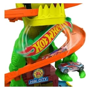 Você pode enfrentar um T-Rex faminto que atacou o quartel de bombeiros da Hot Wheels City com um caminhão de brinquedo em escala 1:64!