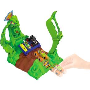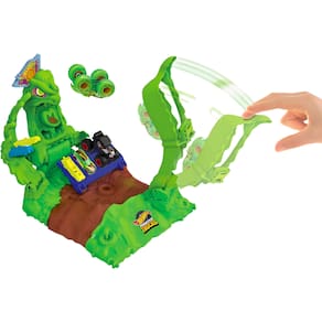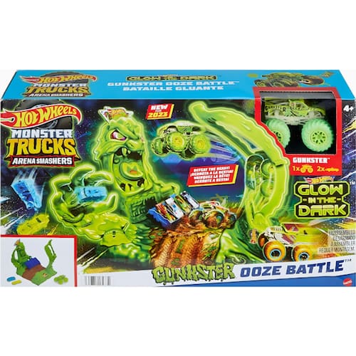 Um monstro chegou à Hot Wheels, envolvendo-a em uma gosma que brilha no escuro e Gunkster é quem vai derrotá-lo. Este conjunto Hot Wheels Monster Trucks Arena Demolição permite que as crianças sintam o poder da destruição nas palmas das mãos com uma base que se move e balança a cada batida e colisão. Ele brilha no escuro para uma ação visualmente emocionante e inclui um caminhão die-cast Gunkster Monster Truck e dois carros para esmagar, que também brilham no escuro, para dar um toque adicional às arquibancadas. As crianças podem conectá-lo a outros conjuntos para uma arena ainda maior. Cada conjunto é vendido separadamente. As cores e as decorações podem variar.
