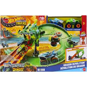 Descrição do produto : Começou a corrida entre os Monster Trucks Great Bite e Rageasaur da Hot Wheels para derrotar o dragão Nêmesis no conjunto Tubarões vs. Dinossauros: Destruição do Dragão. Você pode carregar os caminhões incluídos no lançador duplo e, em seguida, fazê-los correr lado a lado pela boca do dragão ciborgue. Eles correm pelas entranhas do dragão, onde um desviador de motosserra escolhe aleatoriamente um dos três resultados: reter os dois Caminhões, tirar um deles da pista ou deixar que ambos escapem para derrotar o nêmesis. Quando o dragão desmorona, as crianças podem se lançar em sua boca e reivindicar o troféu. Dois Hot Wheels Monster Trucks em escala 1:64 estão incluídos. As cores e as decorações podem variar. :