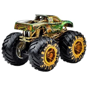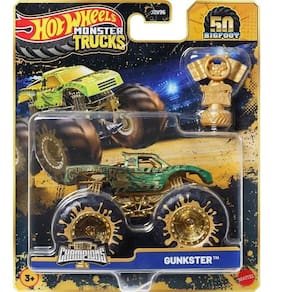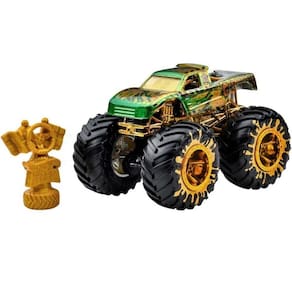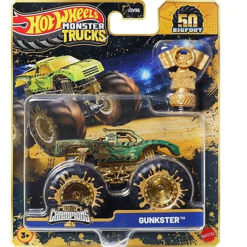 Cada veiculo Die-cast em escala 1:64 apresenta um personagem favorito dos fas do Monster Trucks com caracteristicas premium, como decoracao e detalhes dourados. Inclui um acessorio de trofeu do campeonato Hot Wheels Monster Trucks Live.