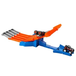 Os Monster Trucks Mega-Wrex e Tiger Shark da Hot Wheels se enfrentam em uma corrida de descida onde um desviador decide aleatoriamente quem vencerá e quem capotará e baterá. Você pode colocar os caminhões de brinquedo em escala 1:64 incluídos na posição de partida e, em seguida, levantá-los para enviá-los em alta velocidade para a linha de chegada.