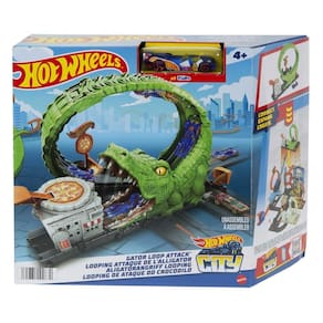 No conjunto Hot Wheels Looping de Ataque do Crocodilo, um crocodilo invadiu a pizzaria Hot Wheels para devorar carros, a menos que as crianças possam detê-lo com suas incríveis manobras. Reposicione a cauda gigante do crocodilo para criar um loop ou hélice para uma brincadeira versátil na pista. Quando as crianças lançam seus carros, elas podem derrubar o crocodilo e correr em direção a novas aventuras. Inclui um carro Hot Wheels que pode se conectar a outros conjuntos. Características: Inclui 1 carro Hot Wheels em escala 1:64. Material/composição: Plástico/Metal Ref: HKX39 Marca: MATTEL Modelo: Hot wheels Idade Indicada: 4+ Escala : 1:64 Imagens meramente ilustrativas Homologação Inmetro: IP-BRI-1465/2021-04 Marca: Não Informado