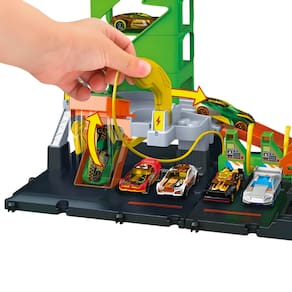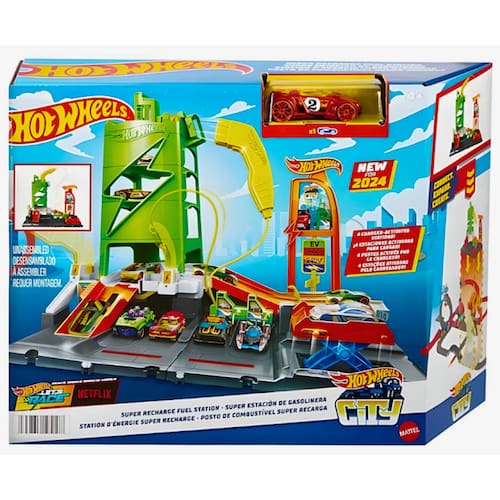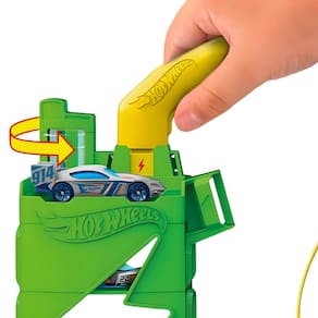 Dirija até a estação de combustível Hot Wheels City Super Recharge para brincadeiras dinâmicas com veículos Hot Wheels O conjunto possui uma mangueira de carregamento EV que pode ser inserida em 4 estações onde ativa recursos legais como lançadores, um elevador de carro e uma virada de sinal.