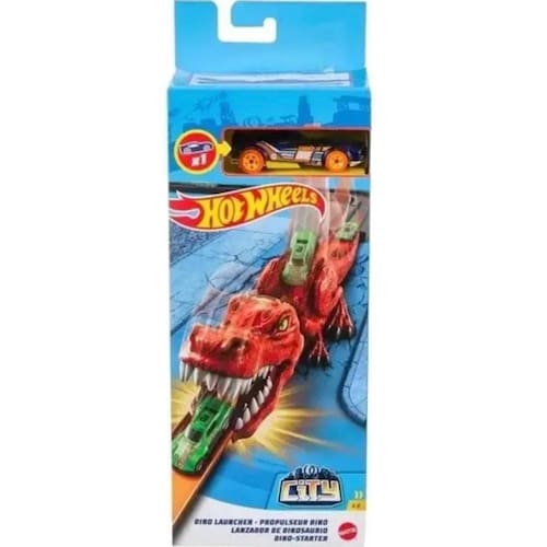 O Hot Wheels™ City Lançador Nêmesis apresenta dois inimigos favoritos das crianças - o T-rex e o tubarão - como lançadores de carros superlegais