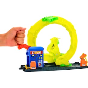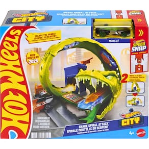 Descrição do produto : Corra e faça acrobacias no Playset Ataque em Espiral da Cobra Hot Wheels, que apresenta uma enorme nêmesis cobra e duas maneiras de brincar! Dirija até o set e reabasteça nas bombas de gasolina com mangueiras ajustáveis, depois vá até o minimercado que também é um lançador secreto. Bata no lançador com força suficiente para lançar os carros em alta velocidade pela boca da cobra e evitar ficar preso e ser devorado. Quando eles forem pegos, puxe a cobra e coloque os carros na pista de carroceria para fazê-los derrapar nas curvas. Um carrinho de brinquedo Hot Wheels está incluído e há estacionamento para dois veículos adicionais na base. (Carrinhos adicionais são vendidos separadamente.) : Detalhes técnicos : Marca: Mattel : Referência: JBM63 : Idade recomendada: 3 : Material: Plastico : Ean: 194735264063 : Peso (kg): 0,70 : Dimensões aproximadas da embalagem: 30 x 25 x 9 cm :