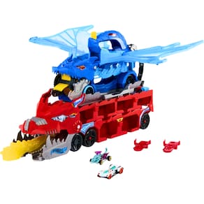 Descrição do produto : Você pode dirigir para a batalha com este caminhão Hot Wheels City Supertrailer de dragão em grande escala que apresenta um dragão adicional destacável que devora veículos de brinquedo! Depois de derrubar carros com o dragão cuspidor de fogo, você pode destravar o dragão menor e transformá-lo em uma pista de corrida! Você pode pressionar o botão para fazer com que suas asas se movam e imitem um dragão de verdade e, em seguida, mergulhar para fazê-lo comer carros. Você pode voltar para a base e liberar os veículos nos lançadores, onde eles poderão decolar em pistas lado a lado! O transportador inclui dois carros em escala 1:64, mas as crianças podem armazenar mais de 20 veículos dentro e sobre os dois dragões. (Carros adicionais vendidos separadamente.) Você pode lançar ou conectar a pista Hot Wheels na frente para brincar na pista. As cores e as decorações podem variar. :